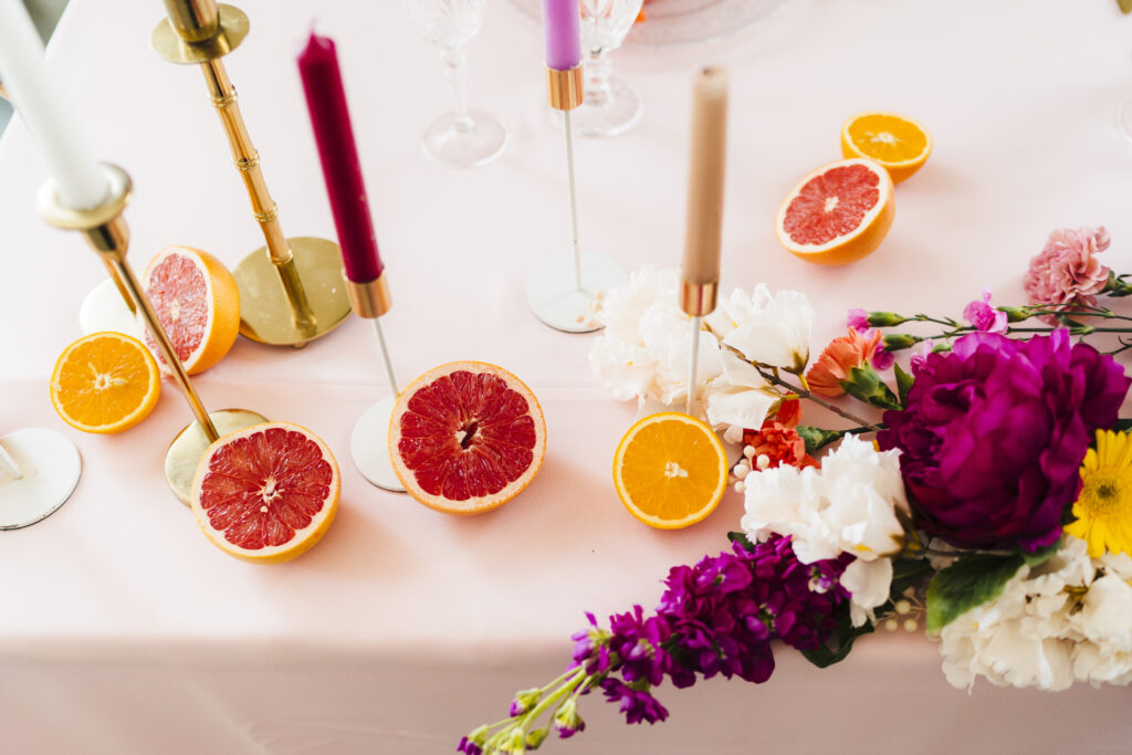 Jedzenie staje się częścią dekoracji. Pary decydują się na efektowne, jadalne elementy dekoracyjne, takie jak torty z kwiatami czy stoły deserowe z sezonowymi owocami.